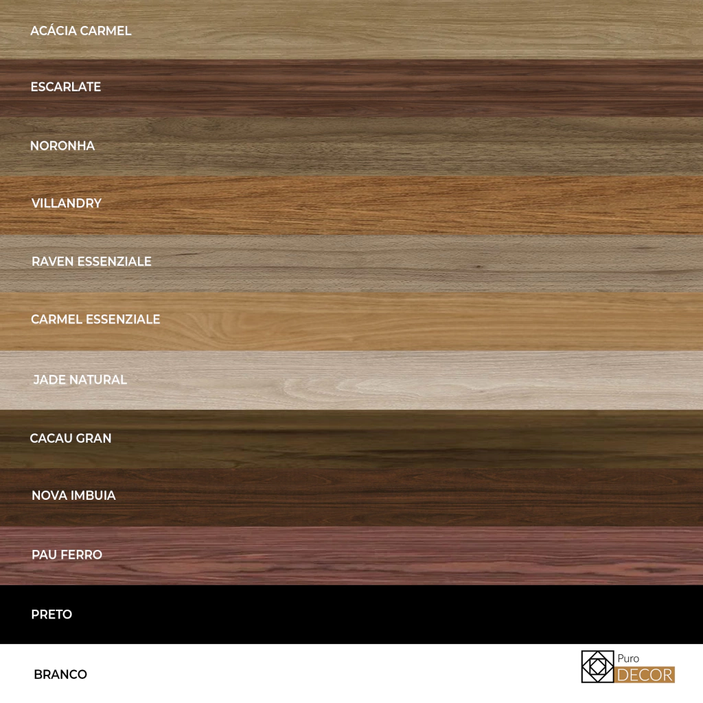 - Tampo e prateleiras em MDF engrossado de 30mm nas cores: Nova Imbuia, Pau Ferro, Cacau Grann, Branca, Preta, Acácia Carmel, Noronha Natural, Villandry, Raven Essenziale, Carmel Essenziale e Jade Natural